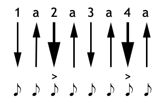 Emphasized strokes are indicated by a thick arrow. — Underneath the arrows, you can find conventional musical notes, that again represent the beat. Here, the emphasized beats are identified by a ">" above the respective notes.